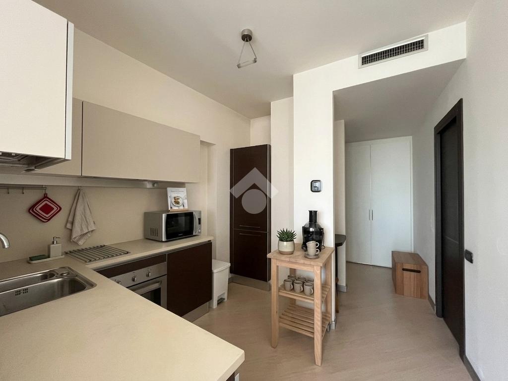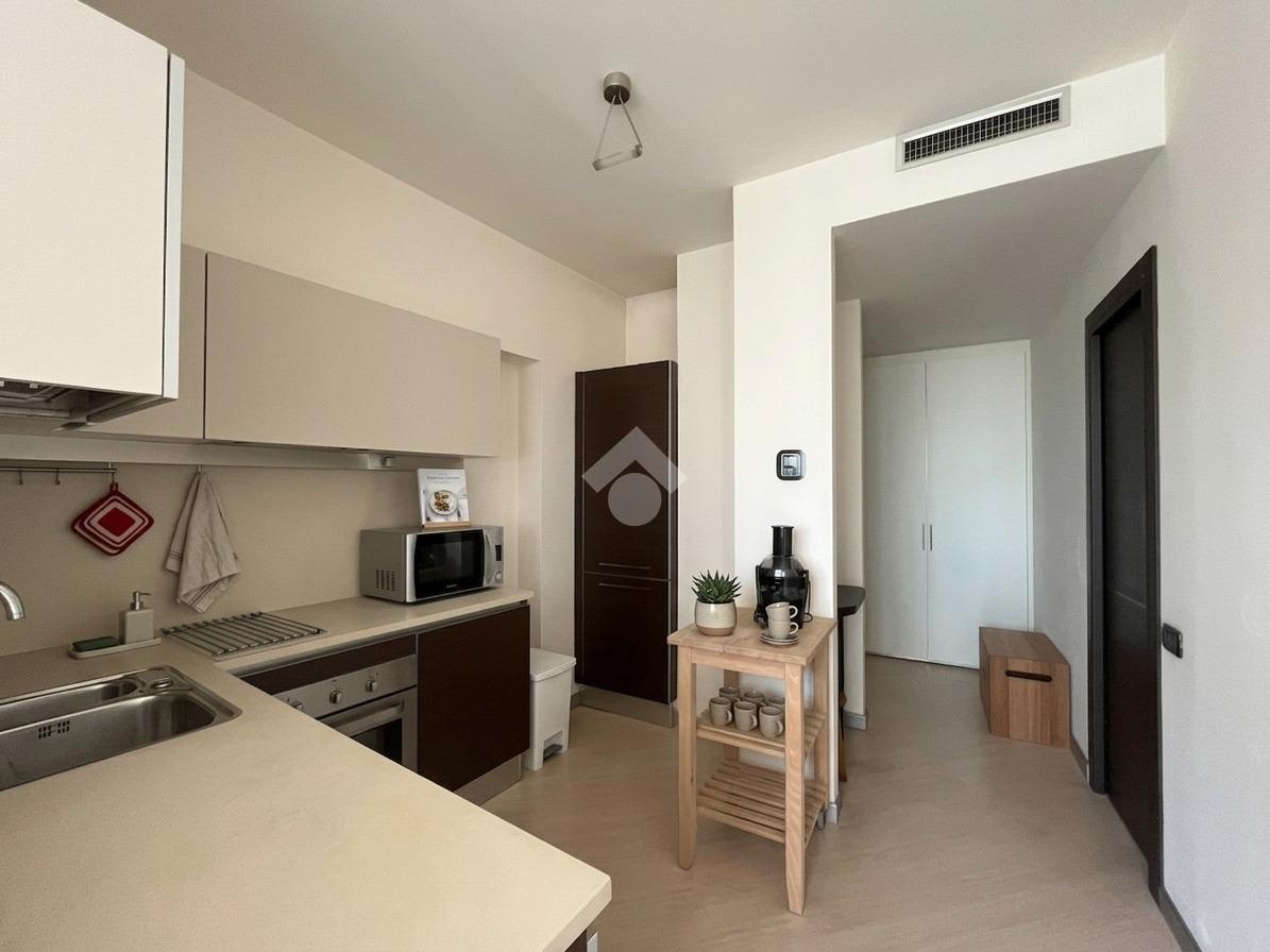 L’ingresso dotato di funzionali armadiature a muro, conduce direttamente alla zona living, un ambiente arioso e luminoso grazie alle ampie vetrate a tutta parete che caratterizzano l'architettura dell'edificio. La cucina a vista si integra armoniosamente nel soggiorno, creando uno spazio conviviale, servito da un pratico bagno di servizio con allaccio per la lavatrice, dedicato alla zona giorno.